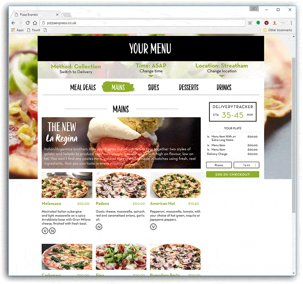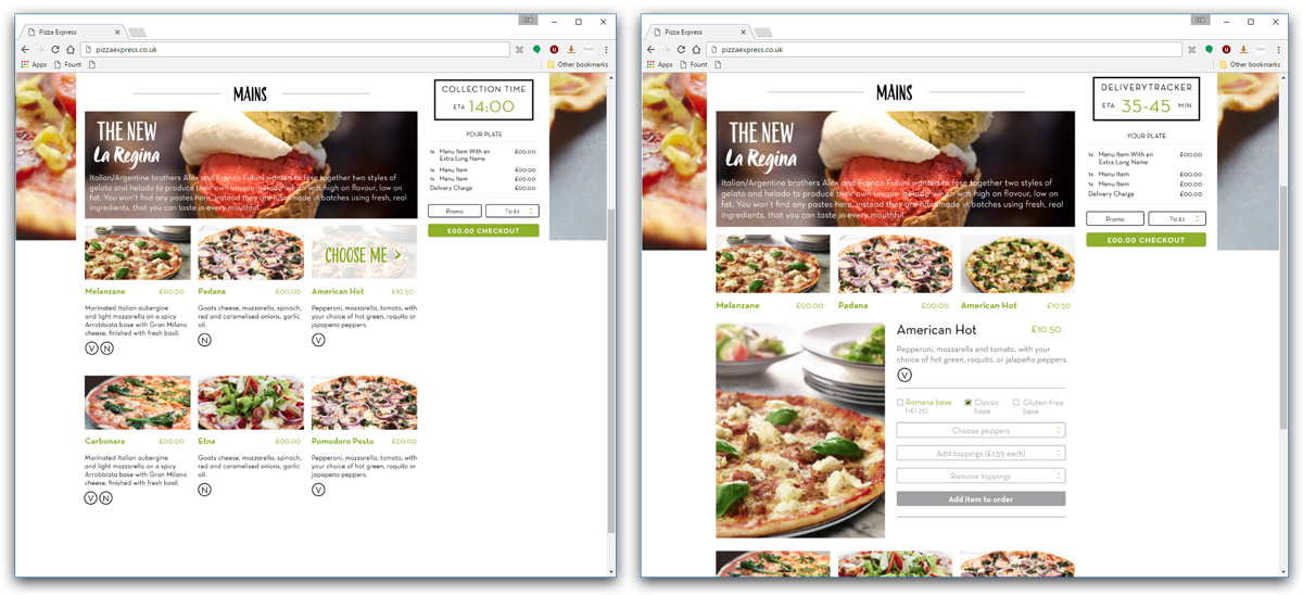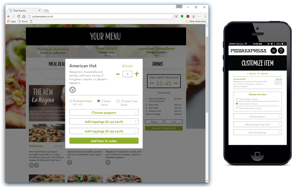 After returning home from studying abroad in London, I continued work remotely for DINEIN. At that time, our CEO had just struck a major deal with Pizza Express, one of the largest pizza chains in the UK. In order to provide deliveries for PE, DINEIN required an interface that could facilitate pizza customization and was compatible with their existing back-end software. I was contracted to plan out and design an interface which added customization functionality and met the needs of the Pizza Express executives overseeing the project.