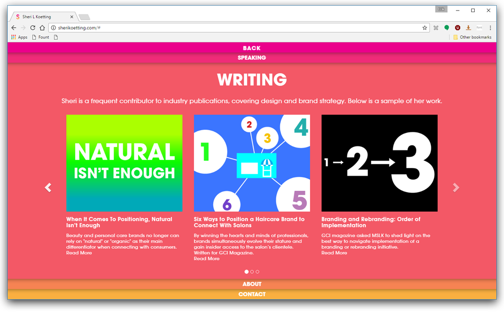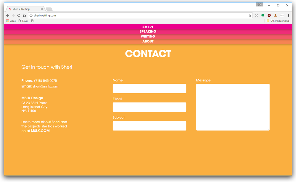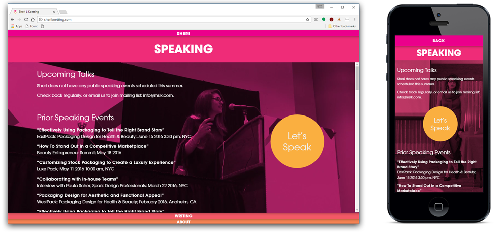 While interning at the design firm MSLK, I was tasked with creating a promotional site for one of the heads of the company, Sheri Koetting. Sheri had become active as a speaker at several design conferences, and wanted a website that she could use to promote her services. I worked with Sheri to establish a site design that communicated her abilities as a designer, and made it easy for her to share conference schedules.
