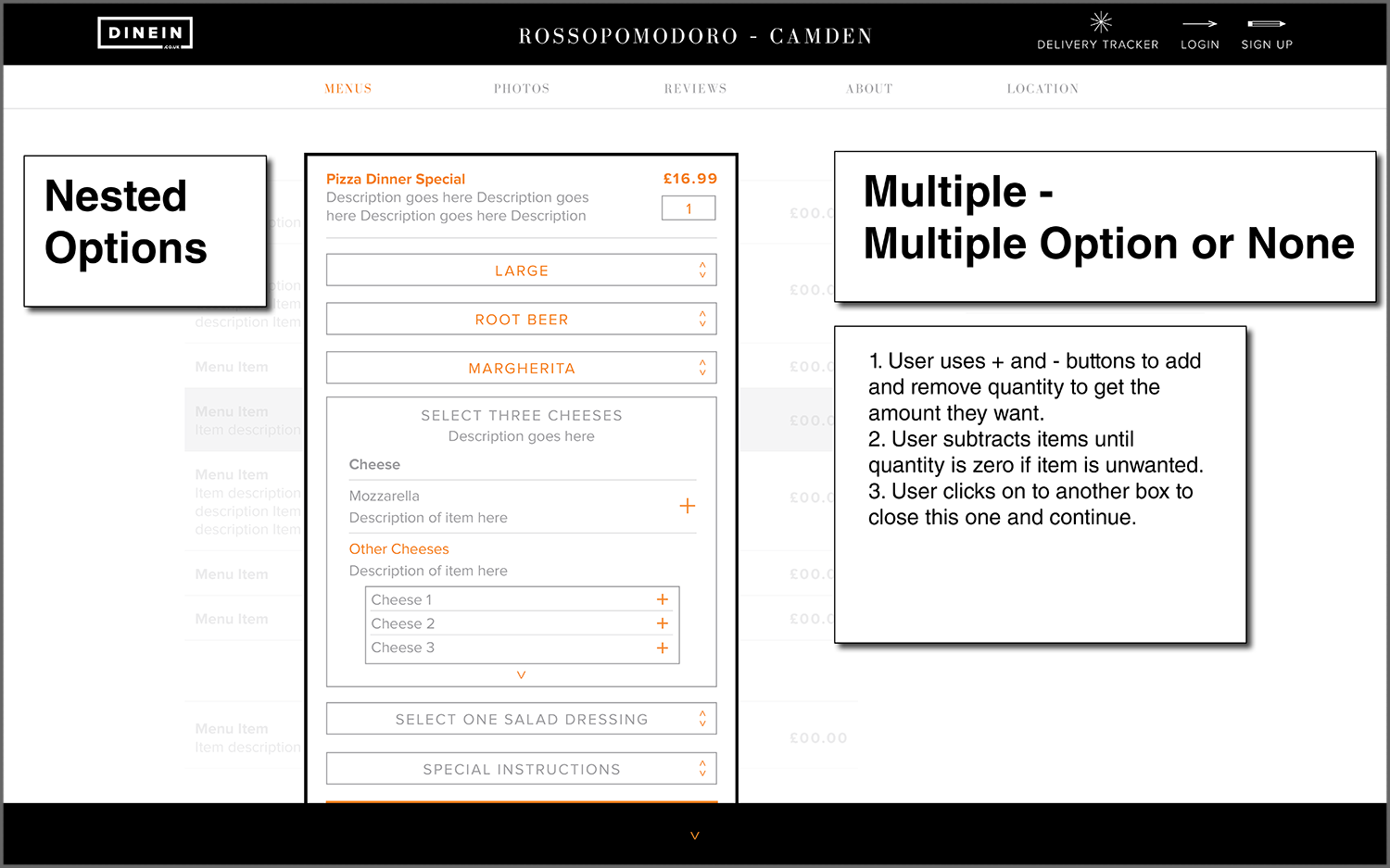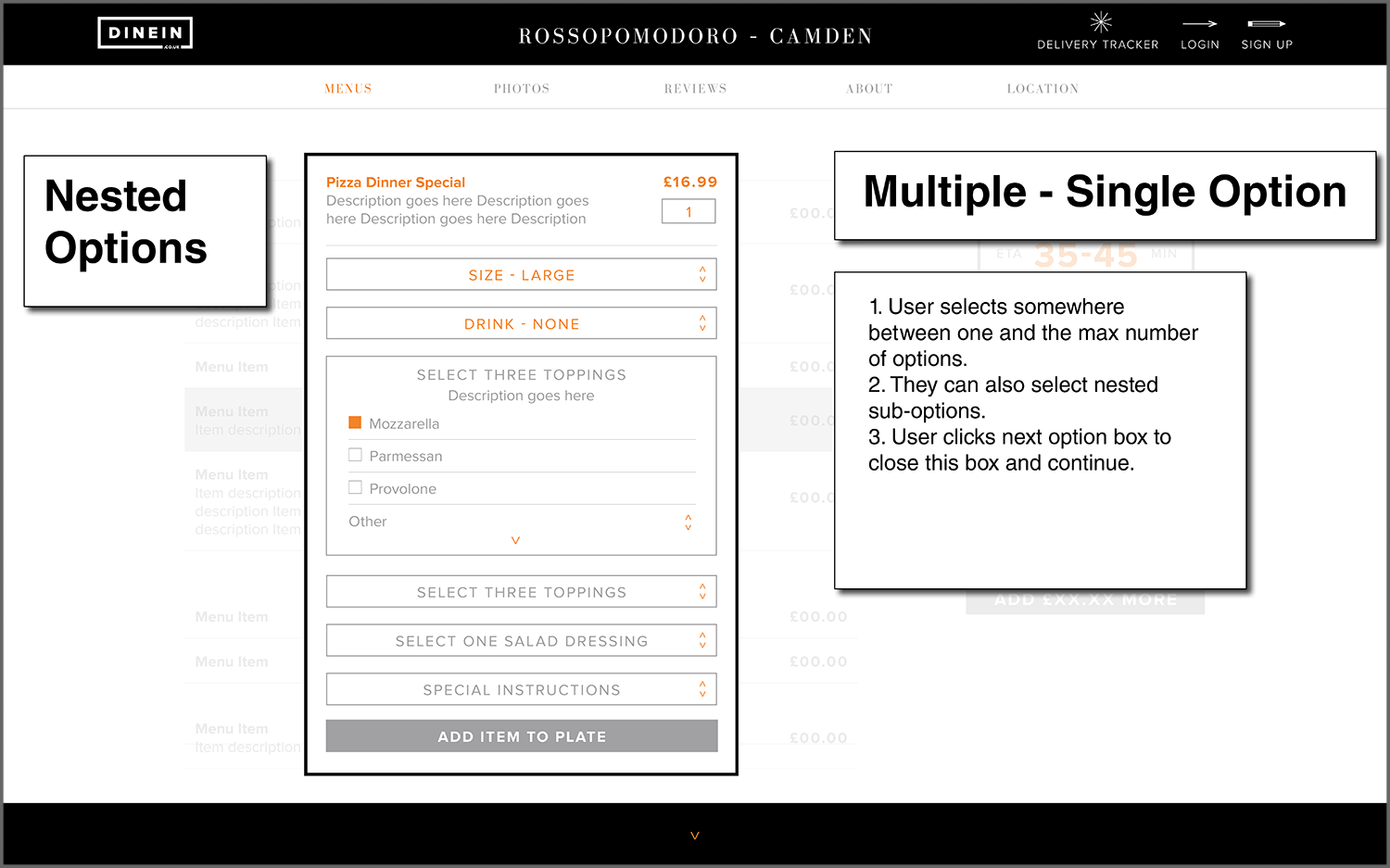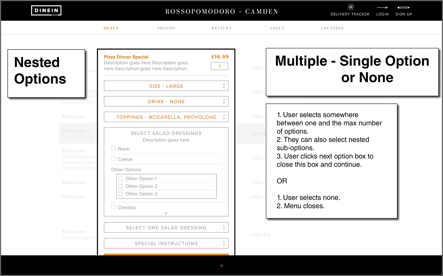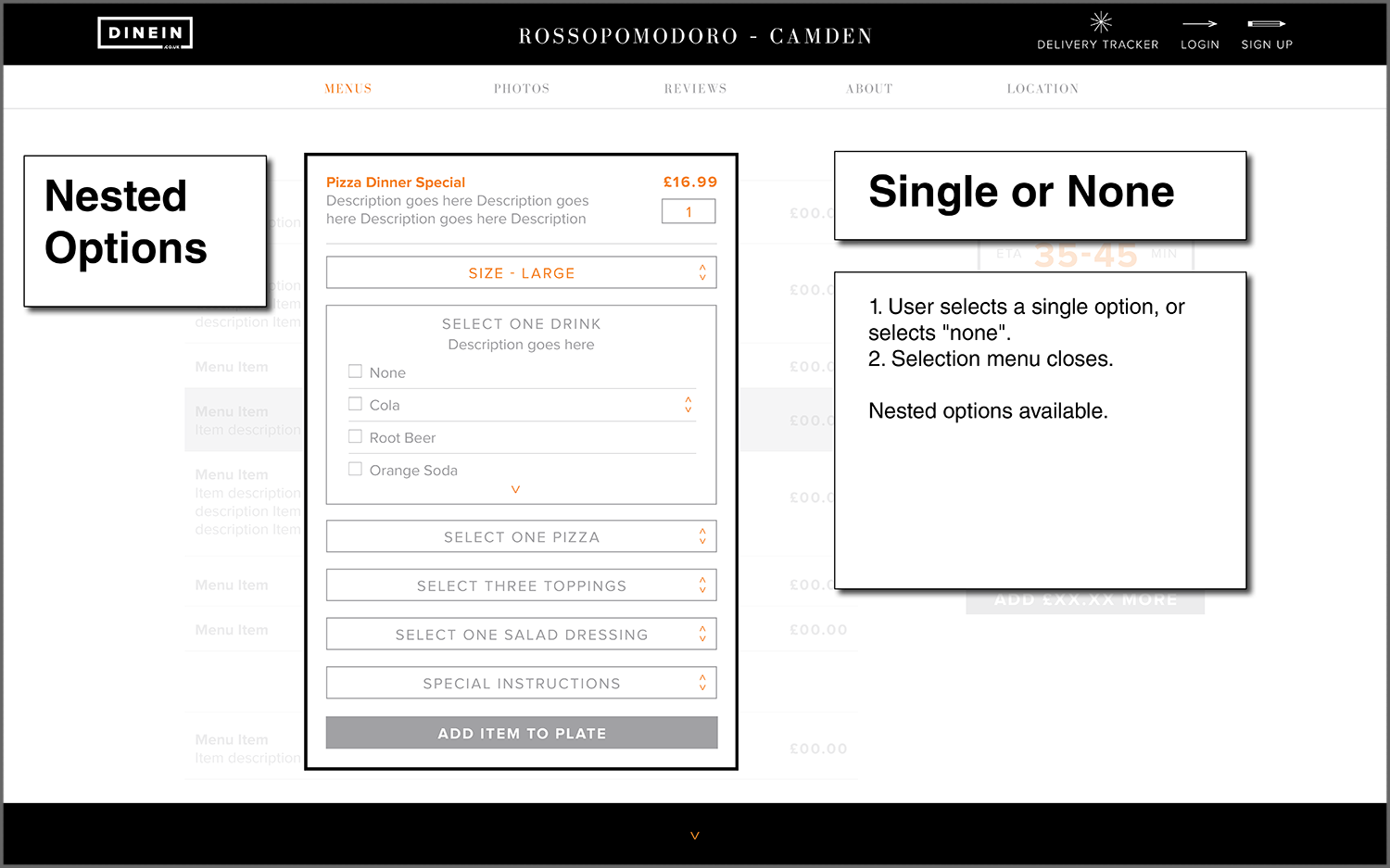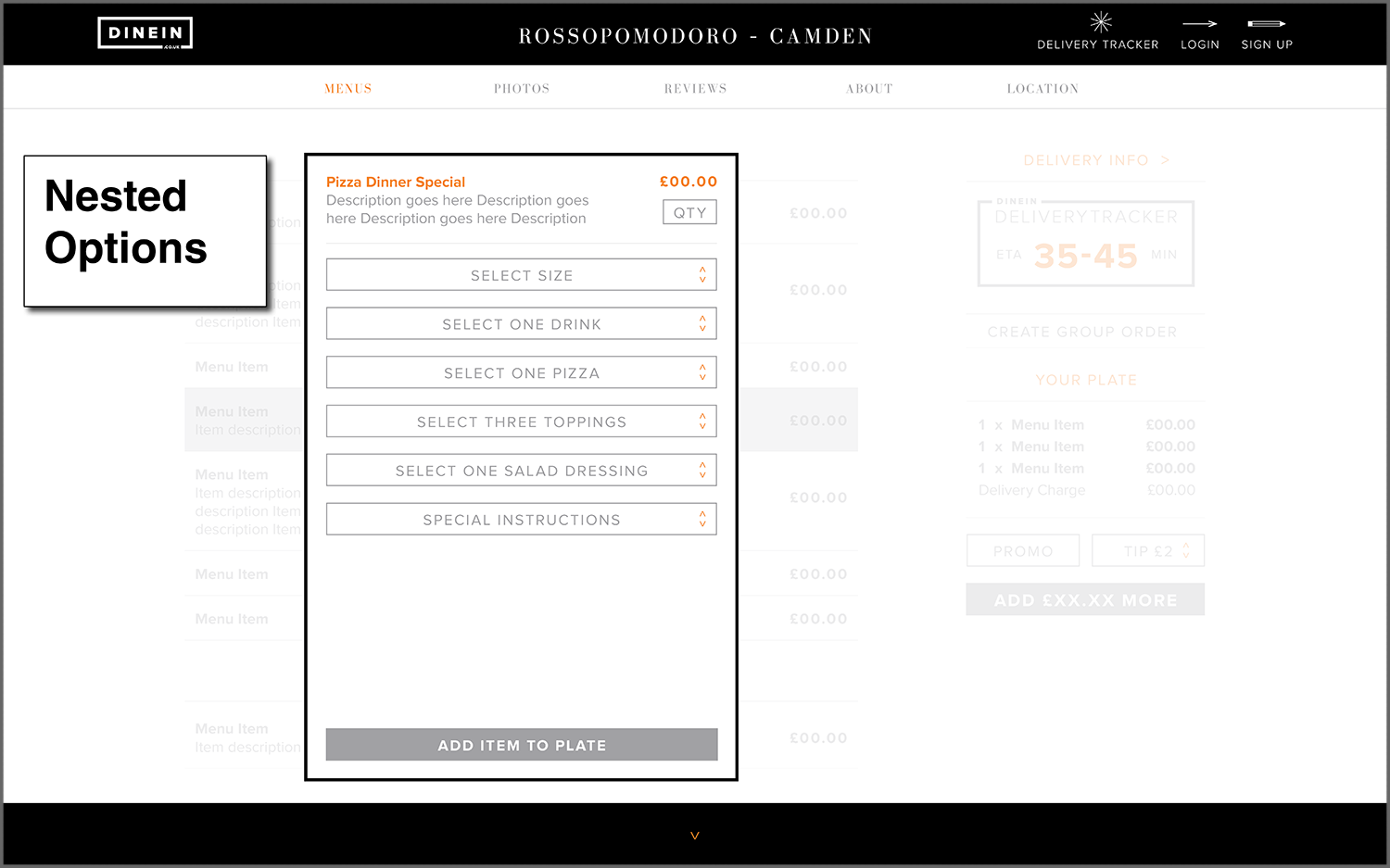 While studying abroad in London, I had the opportunity to work for the food delivery startup “dinein.co.uk”. While there I assisted with the overhaul of their food ordering interface. Before it closed, DINEIN helped restaurants across the UK deliver food to customers by supplying them with drivers and a web interface which was used to place and customize orders. I helped overhaul their outdated interface by providing programmers with UI mockups and wire-frames.