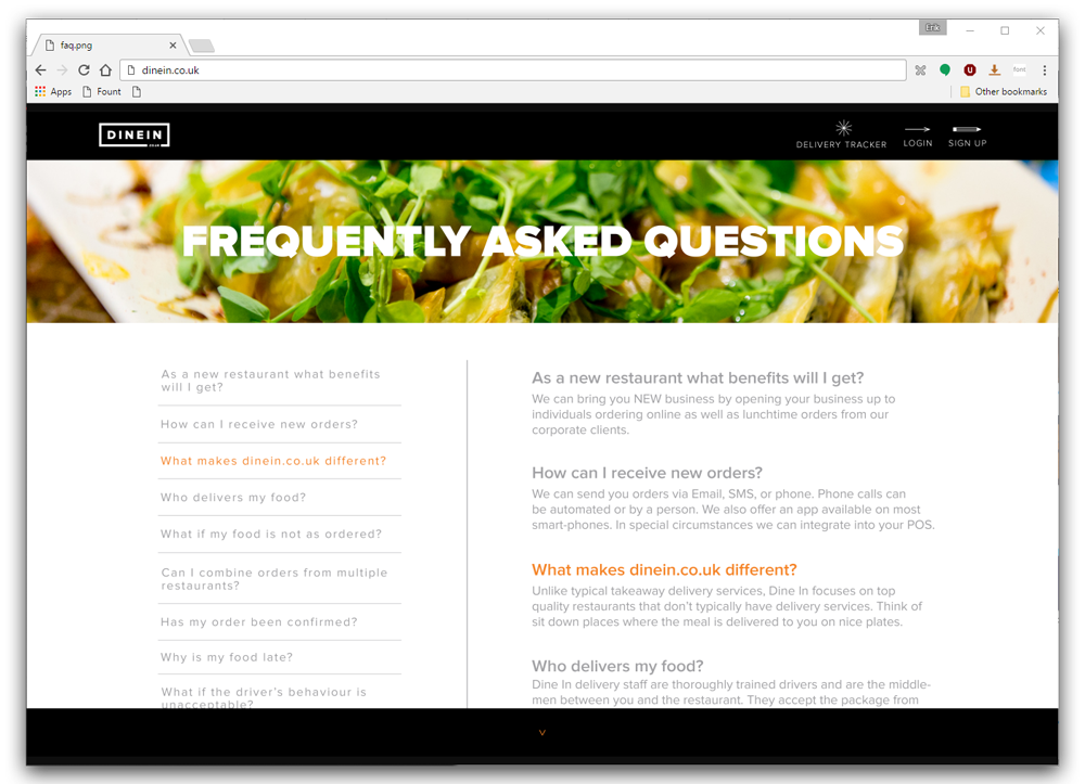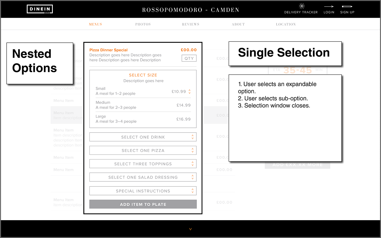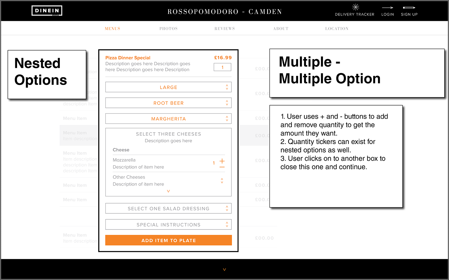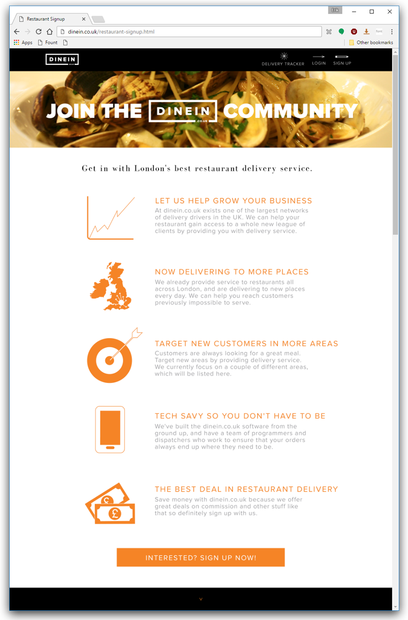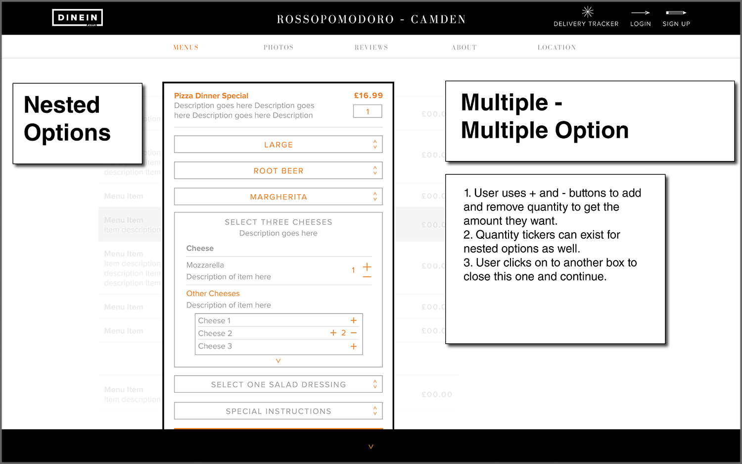 While studying abroad in London, I had the opportunity to work for the food delivery startup “dinein.co.uk”. While there I assisted with the overhaul of their food ordering interface. Before it closed, DINEIN helped restaurants across the UK deliver food to customers by supplying them with drivers and a web interface which was used to place and customize orders. I helped overhaul their outdated interface by providing programmers with UI mockups and wire-frames.