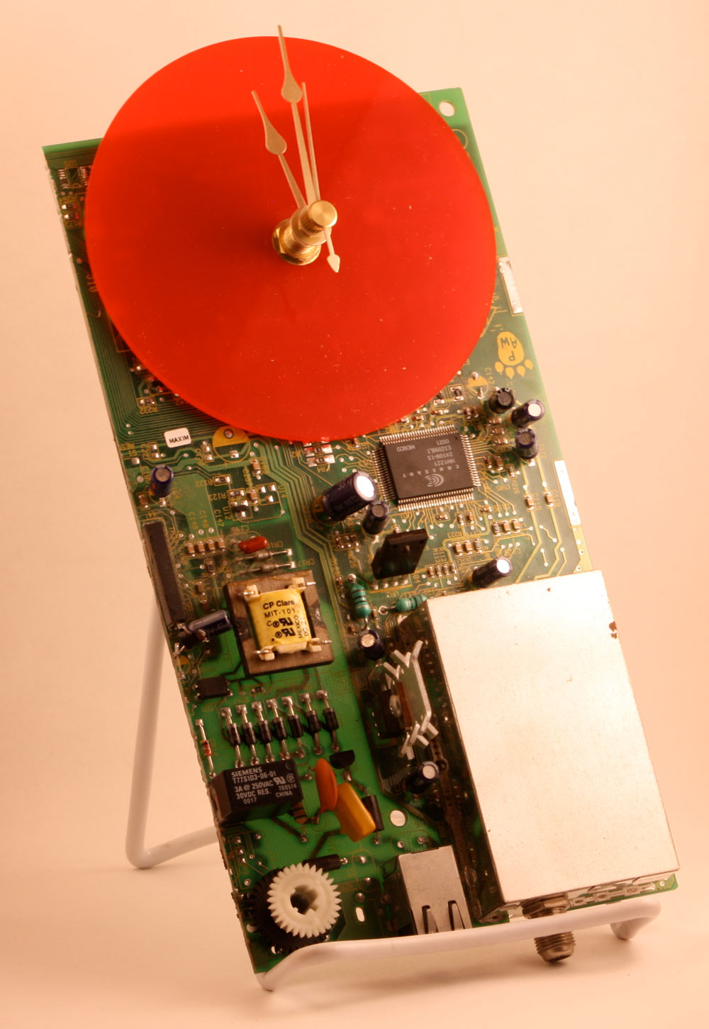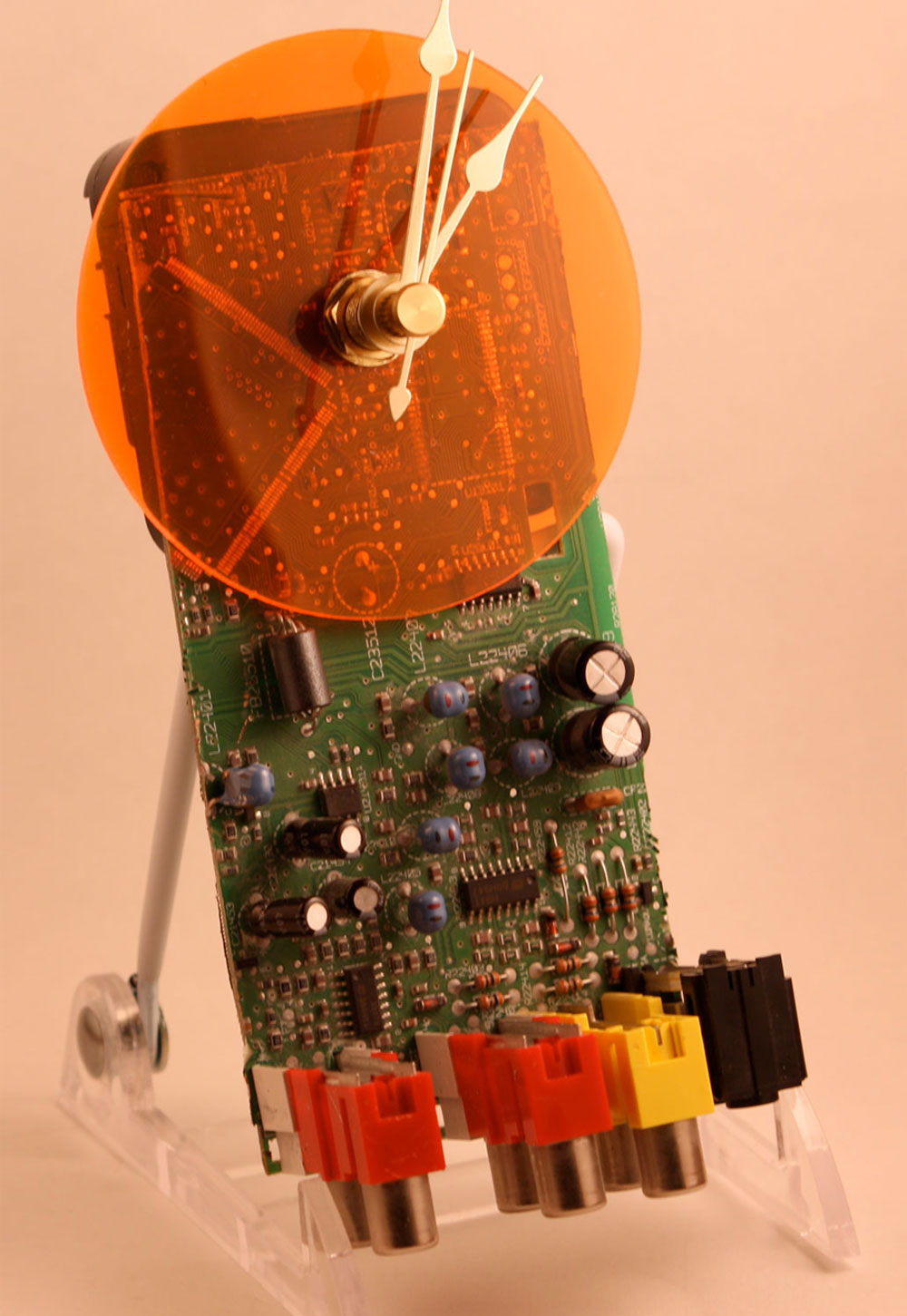 I found unused electronics around my own house, and also offered to take discarded products from neighbors and family friends. I cut up the circuit boards using a Dremel tool and varied the designs of the individual clocks depending on the material and look of the available circuit boards.