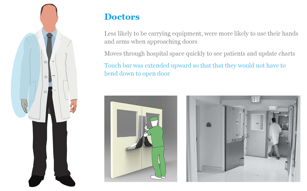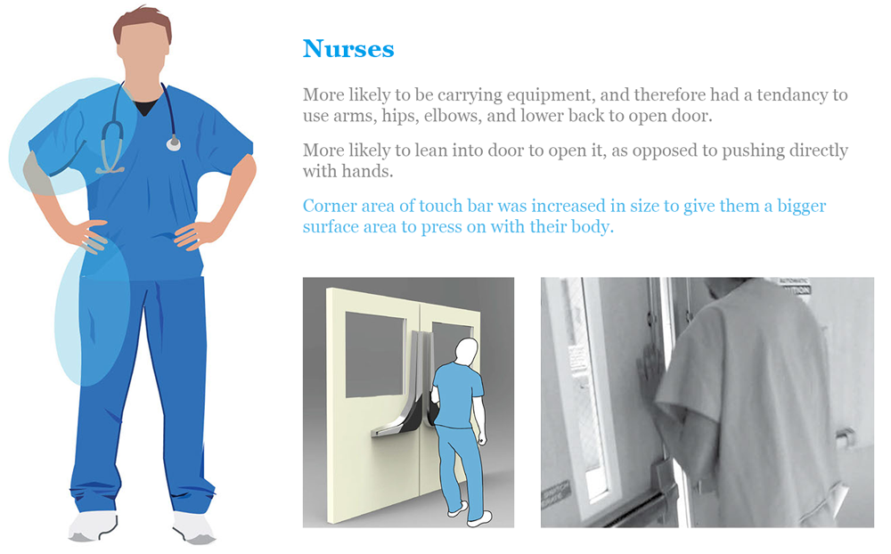 These kinds of modifications indicated to us that the push bars were not currently meeting the needs of their users. We focused on creating a design that would optimize a touch bar for the hospital environment. Our goal was to adapt the modifications the staff had made to the touch bar into a more sanitary form whose design was more deeply informed the needs of its users.