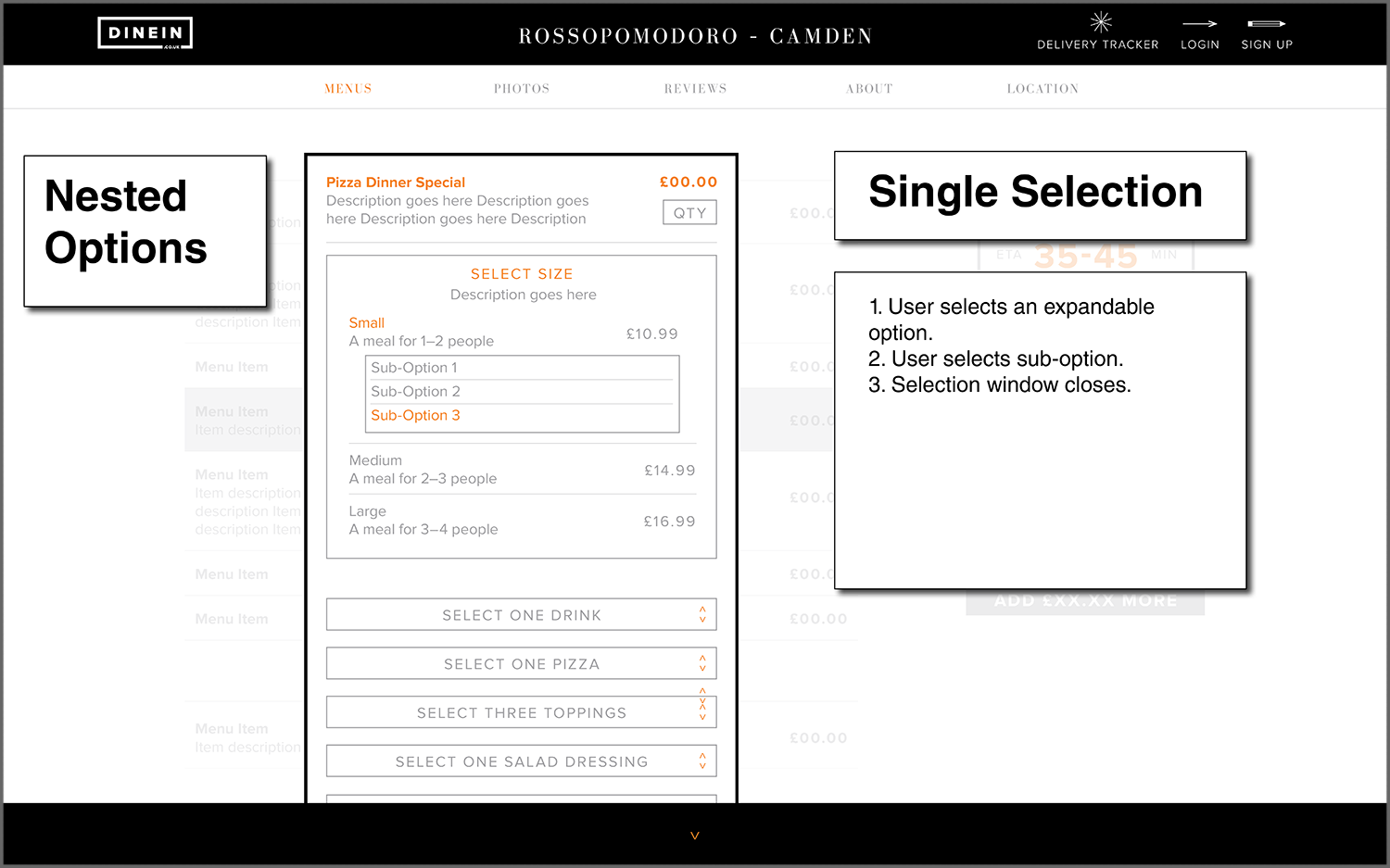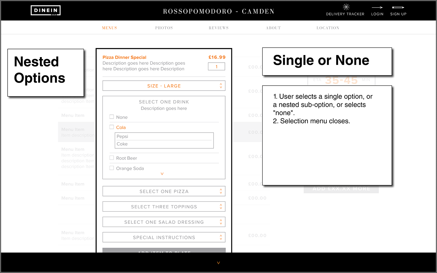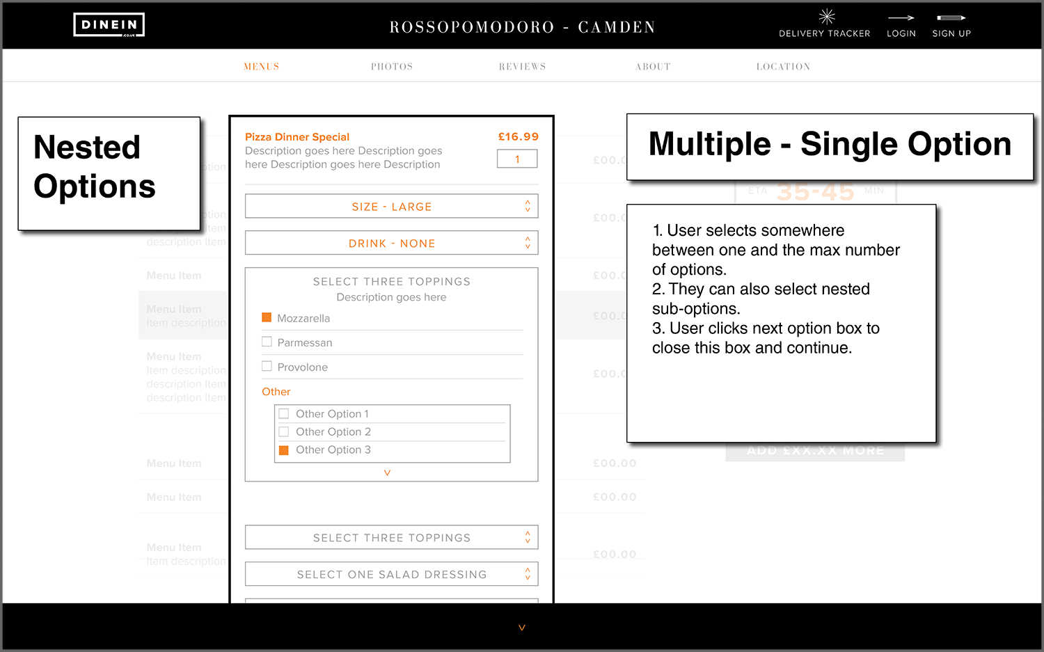 While studying abroad in London, I had the opportunity to work for the food delivery startup “dinein.co.uk”. While there I assisted with the overhaul of their food ordering interface. Before it closed, DINEIN helped restaurants across the UK deliver food to customers by supplying them with drivers and a web interface which was used to place and customize orders. I helped overhaul their outdated interface by providing programmers with UI mockups and wire-frames.