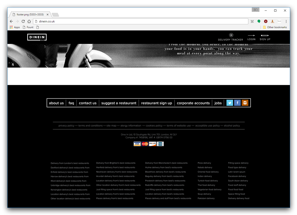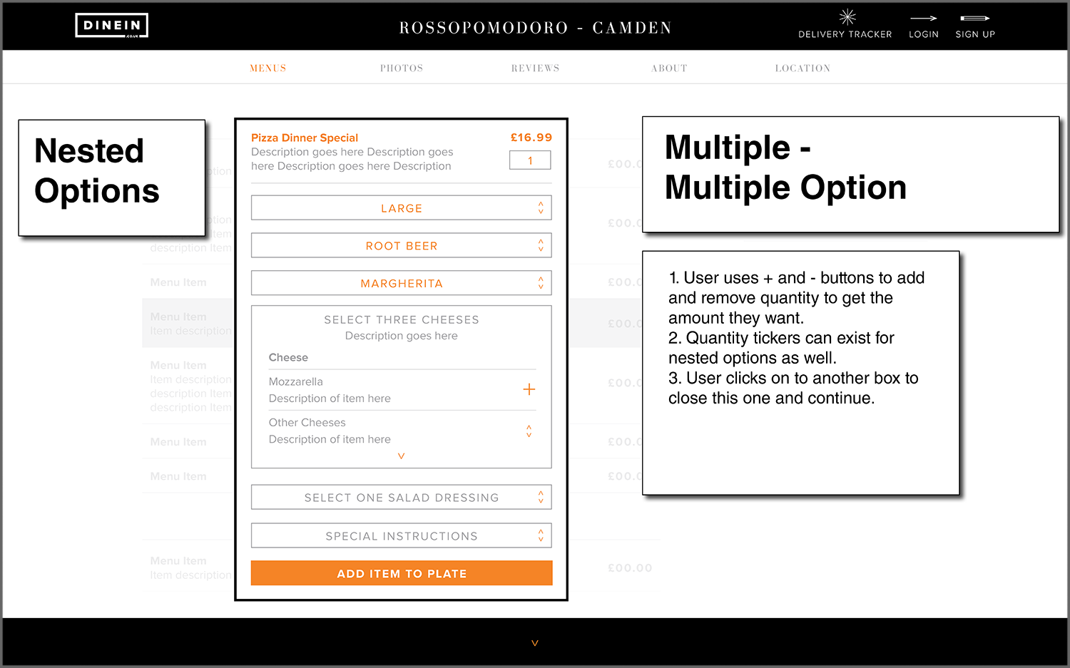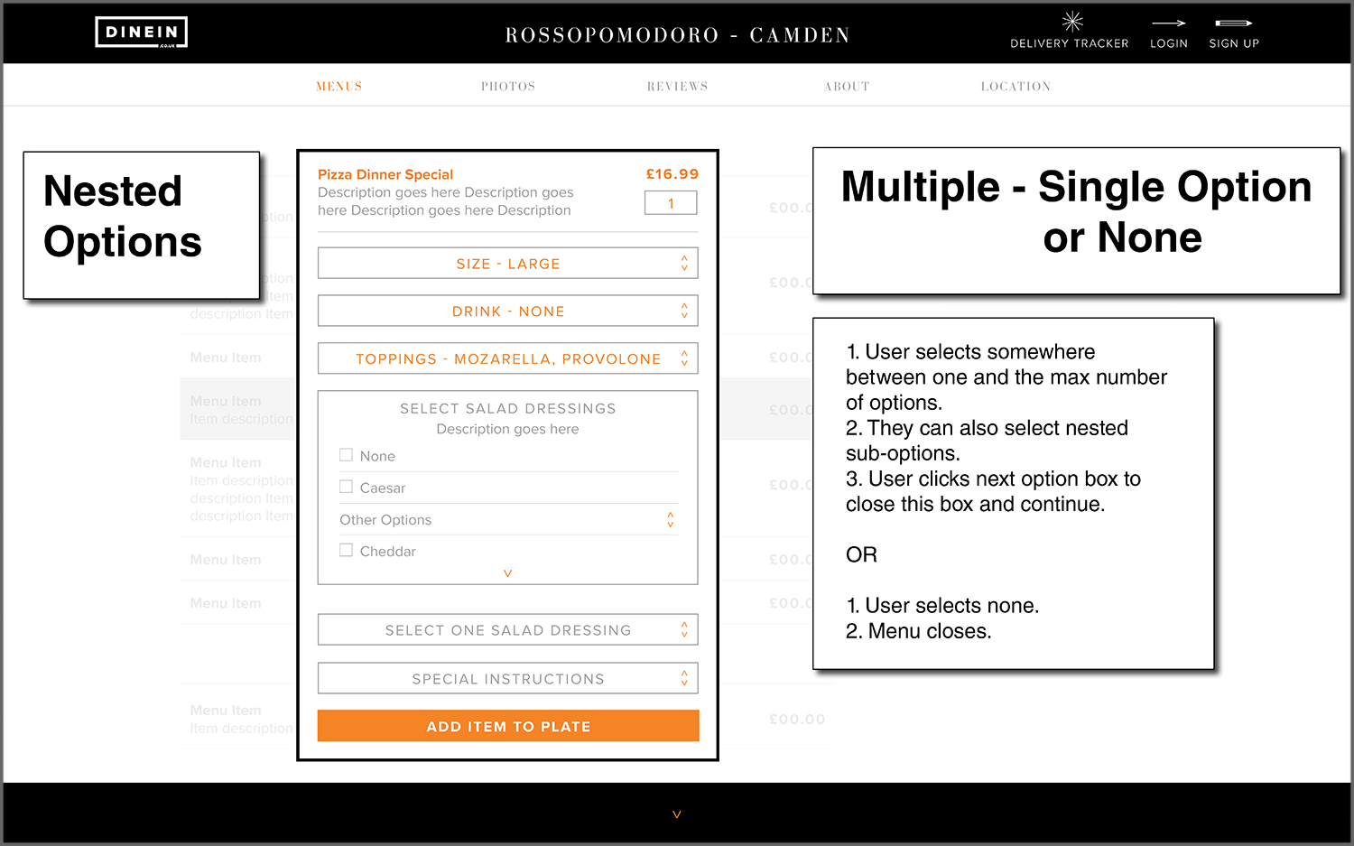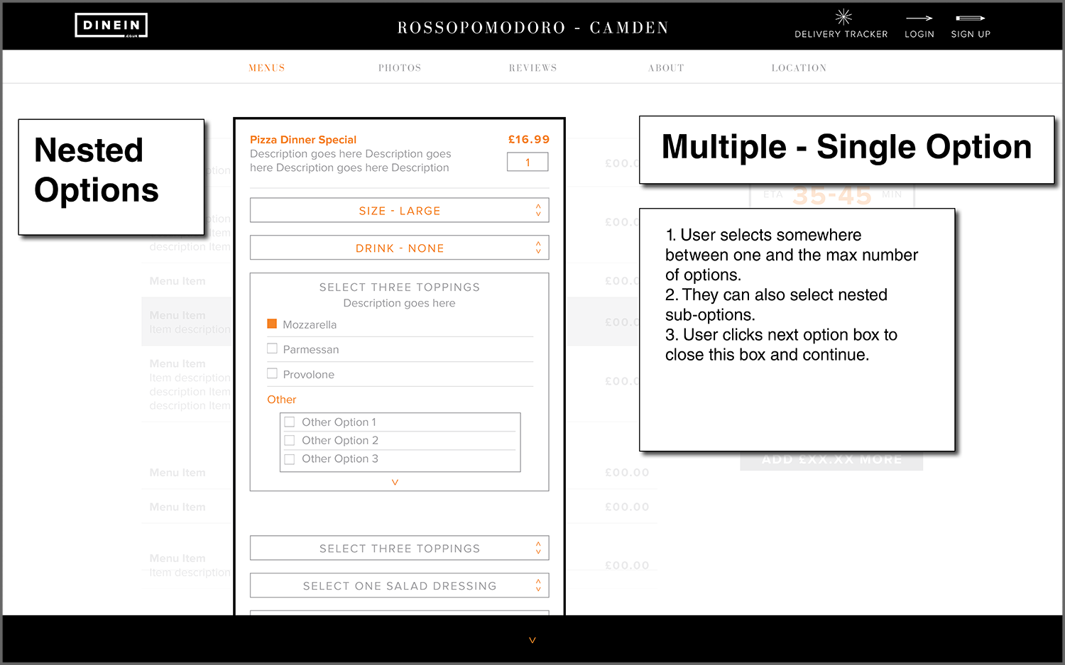 While studying abroad in London, I had the opportunity to work for the food delivery startup “dinein.co.uk”. While there I assisted with the overhaul of their food ordering interface. Before it closed, DINEIN helped restaurants across the UK deliver food to customers by supplying them with drivers and a web interface which was used to place and customize orders. I helped overhaul their outdated interface by providing programmers with UI mockups and wire-frames.