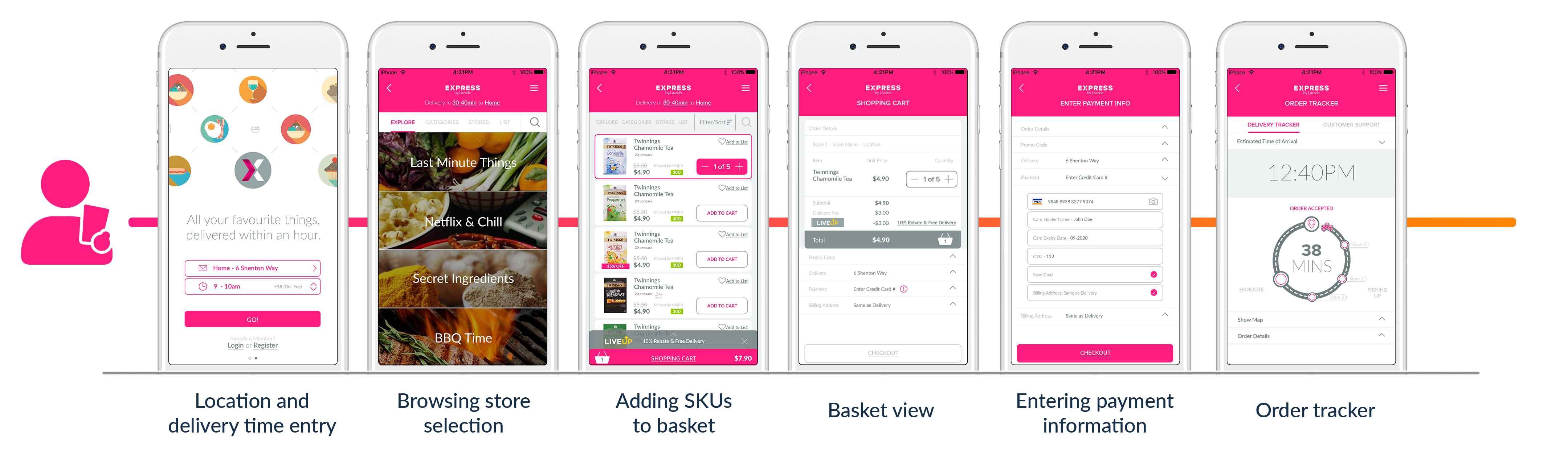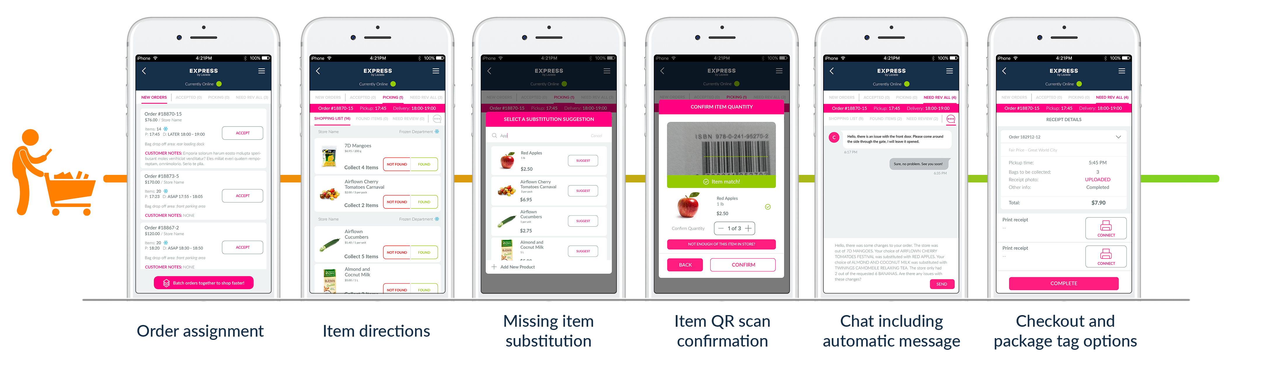 The EXPRESS consumer app provides a modular shop front end which enables store owners to customize how their SKUs are displayed. Customers browse the app, select items to add to their basket, and once they are ready may place an order. Once placed, orders are sent to the pick/packers working in-store.
