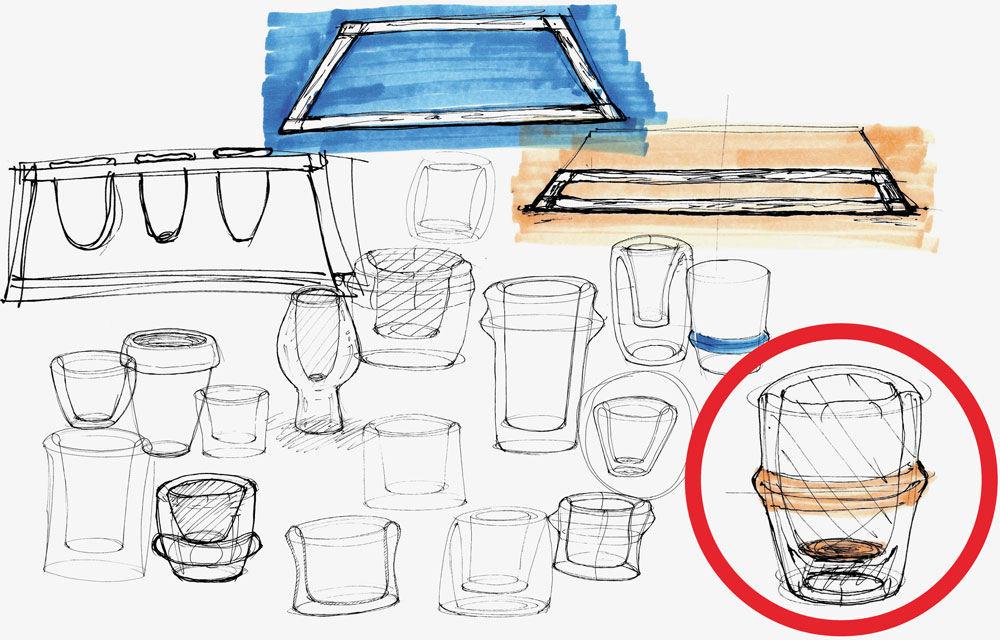 For the redesigned tasting glass, we aimed to decrease its size, incorporate a holder to group each customer’s choices together, and to also use the Beak & Skiff brand colors on the glasses as flavor indicators.